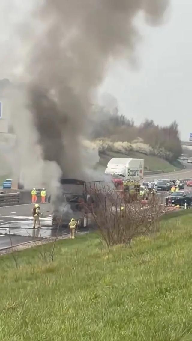 英国国家公路局表示:“沃里克郡境内的M6收费高速公路南行方向,T4(韦福德)至T2(科尔斯希尔)路段因一辆客车起火而封闭。包括沃里克郡消防救援局在内的应急部门已在现场处置,国家公路局交通官员也在现场协助交通管理。”